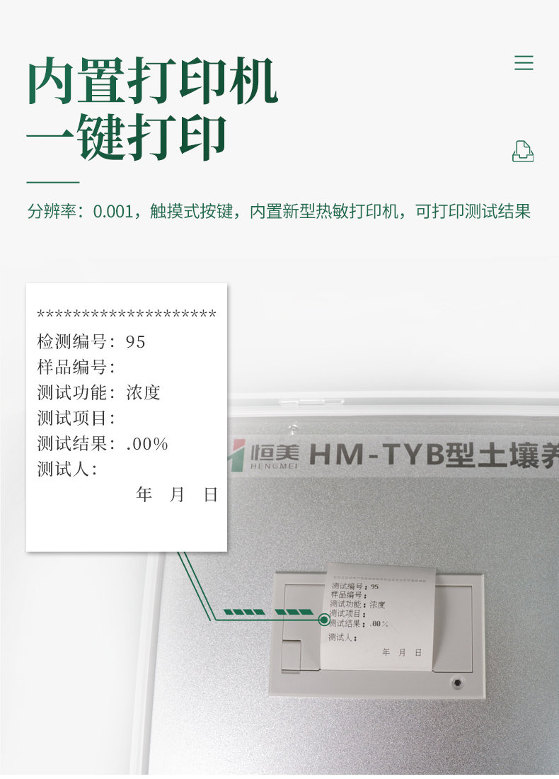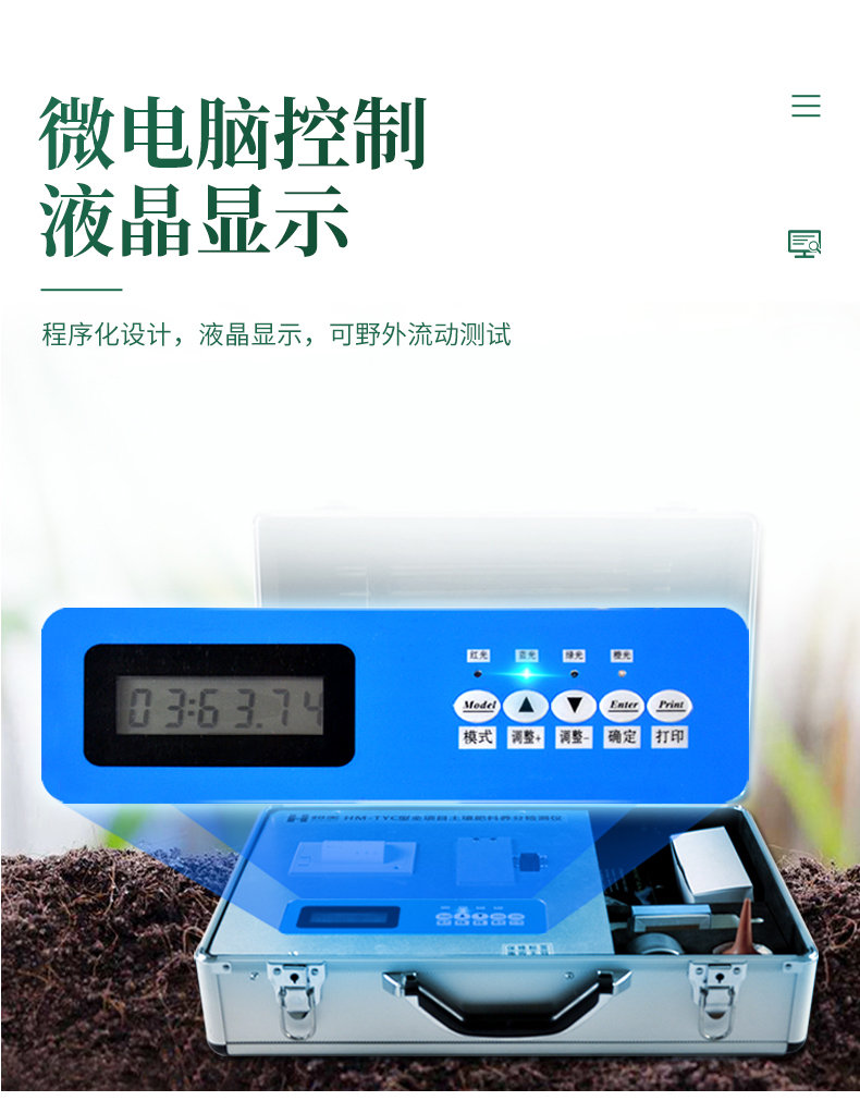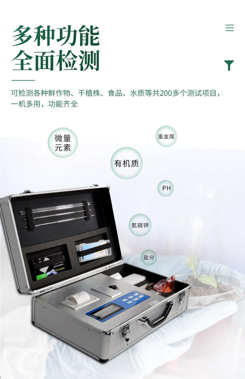 (!配套性好,內(nèi)置鋰電池,打印機(jī),及測(cè)試用到的所有配件, 保證用戶只需提供純凈水即可完成氮磷鉀有機(jī)質(zhì)pH含鹽量的準(zhǔn)確測(cè)定!)