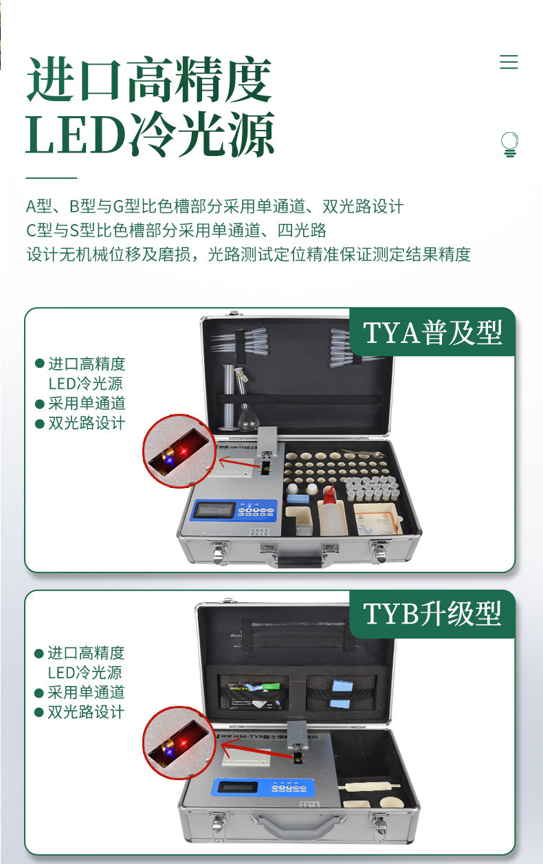 5、土壤養(yǎng)分速測(cè)儀采用高亮度 LED 燈作為光源, 硅半導(dǎo)體作為信號(hào)接收系統(tǒng), 壽命長達(dá)10萬小時(shí)級(jí)別。光源穩(wěn)定,一致性好。