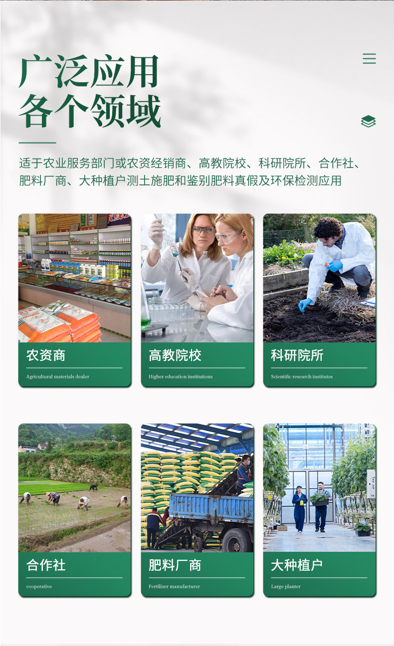 4、可檢測(cè)土壤及化肥、有機(jī)肥、植株中的速效氮、有效磷、速效鉀、全氮、全磷、全鉀、有機(jī)質(zhì)含量,土壤酸堿度,含鹽量(擴(kuò)展)。