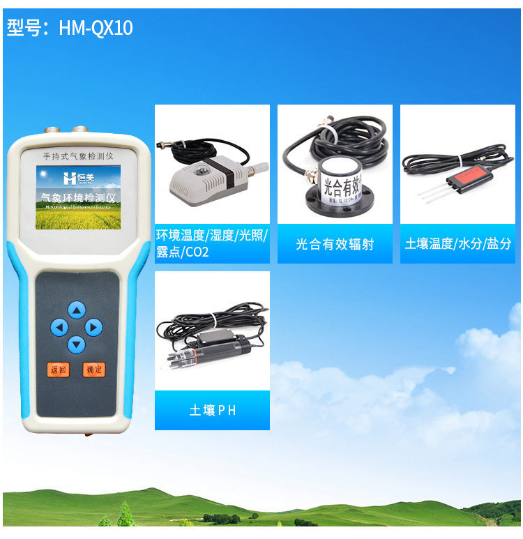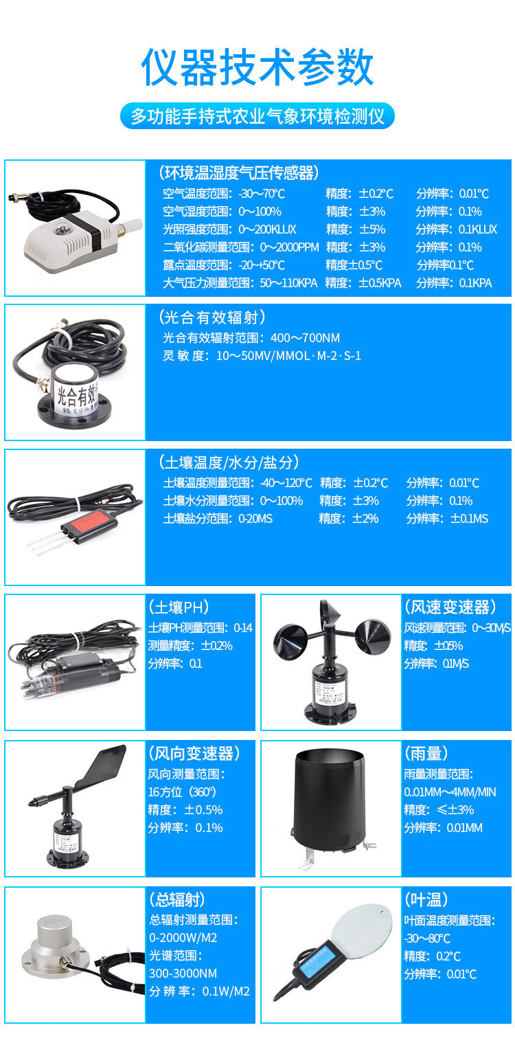 手持式智能農業氣象環境檢測儀是我們專門針對農田、草場局部小尺度環境設計的,對與植被和農作物生長密切相關的土壤、水氣等環境參數監測的農田小氣候站。它主要觀測與農業相關的空氣溫度、空氣濕度、光照強度、二氧化碳濃度、露點溫度、光合有效輻射、土壤溫度、土壤水分、土壤鹽分、土壤PH、風速、風向、降雨量、大氣壓力、總輻射、葉面溫度等16個環境參數氣象要素,為農業科研、農業生產等提供良好的支持。