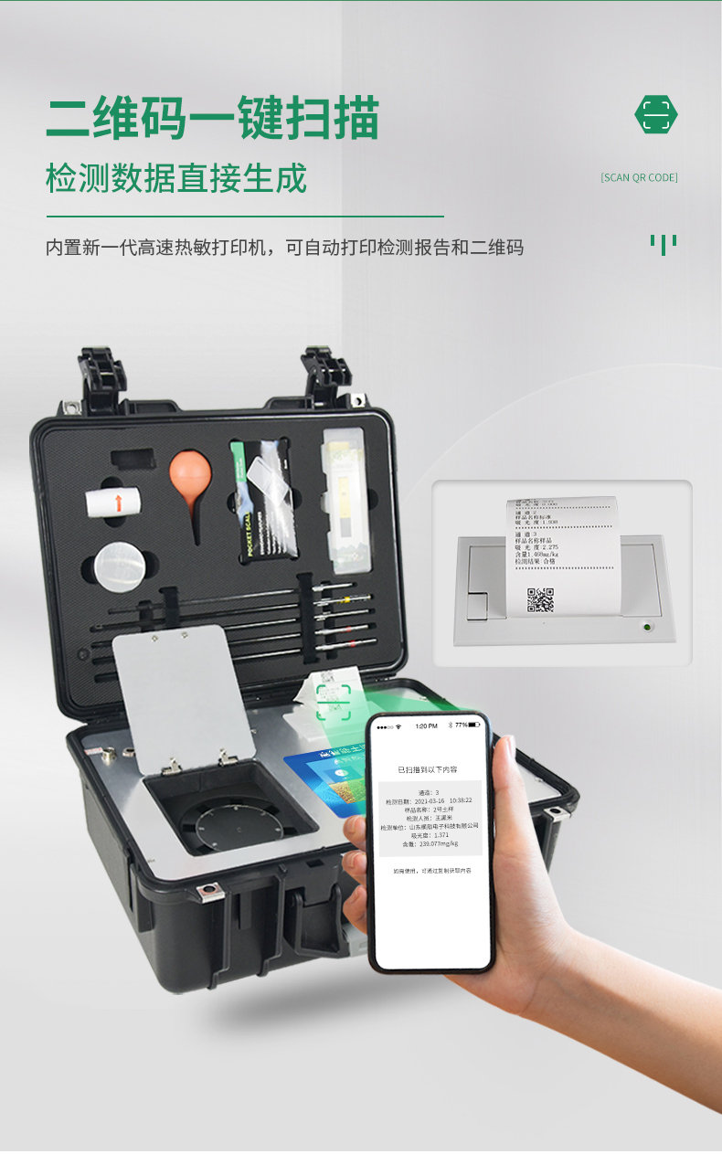 14、內置新一代高速熱敏打印機(無需色帶),打印內容包含:檢測單位、檢測人員、檢測項目、通道號、吸光度、養分含量(mg/kg)、檢測時間、以及二維碼等信息