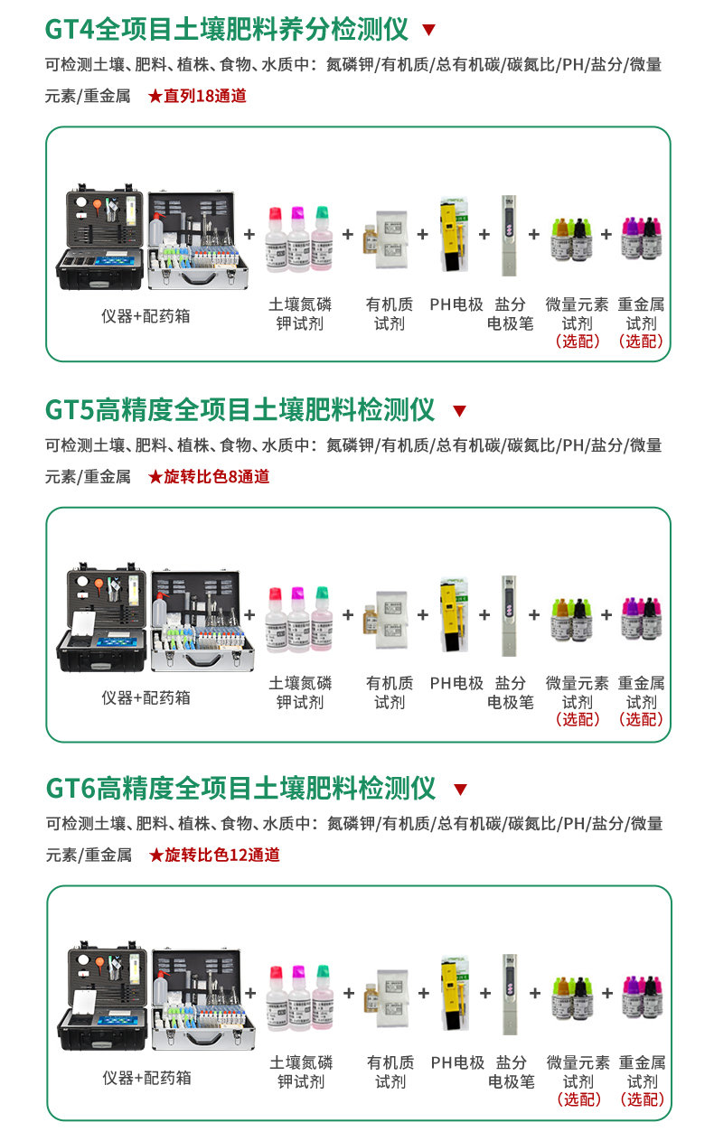 配套齊全:該儀器集藥、器、儀為一體,攜帶方便,相當于一個小型移動實驗室,無需用戶自配附件,亦可靈活野外流動測試。適于農業服務部門或農資經銷商、高教院校、科研院所、合作社、肥料廠商、大種植戶測土施肥和鑒別肥料真假及環保檢測應用。