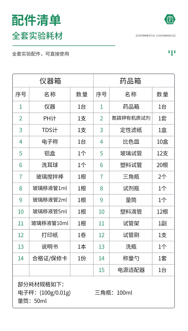 | 2 | PH計 | 1支 | 2 | 氮磷鉀有機質試劑 | 1套 |