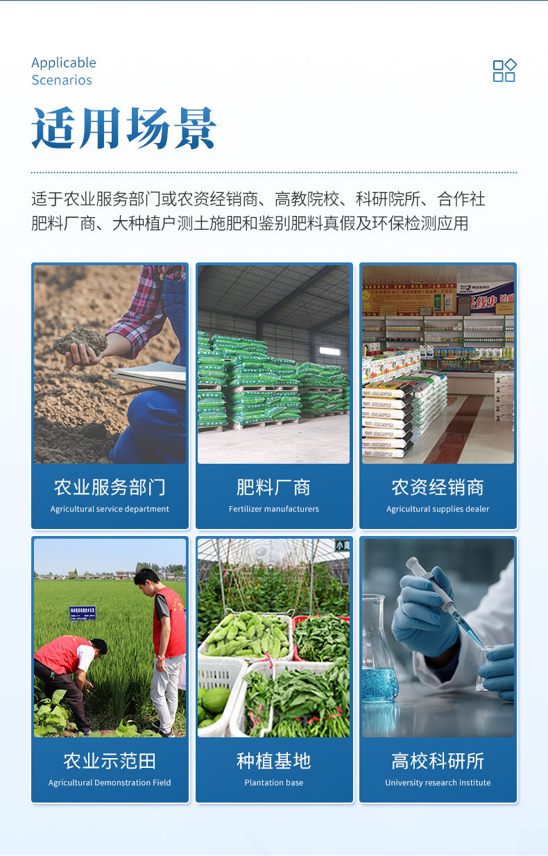 2、肥料養分:●單質肥:氮肥中銨態氮、肥料硝態氮、尿素氮、縮二脲、磷肥中磷、磷肥中水溶性磷、鉀肥中鉀;●復合肥全氮、復合肥全磷、復合肥全鉀;●有機肥全氮、有機肥全磷、有機肥全鉀、有機肥硝態氮、有機肥速效磷、有機肥速效鉀、有機肥酸解氮、有機質;●水溶性腐植酸(風化煤)、水溶性腐植酸(褐煤)、水溶性腐植酸(泥炭)、游離態腐植酸(風化煤)、游離態腐植酸(褐煤)、游離態腐植酸(泥炭);●水溶肥全氮、水溶肥全磷、水溶肥全鉀;●葉面肥全氮、葉面肥全磷、葉面肥全鉀;●各種肥料微量元素:肥料鈣、肥料鎂、肥料硫、肥料硅、肥料硼、肥料鐵、肥料銅、肥料錳、肥料鋅、肥料氯。