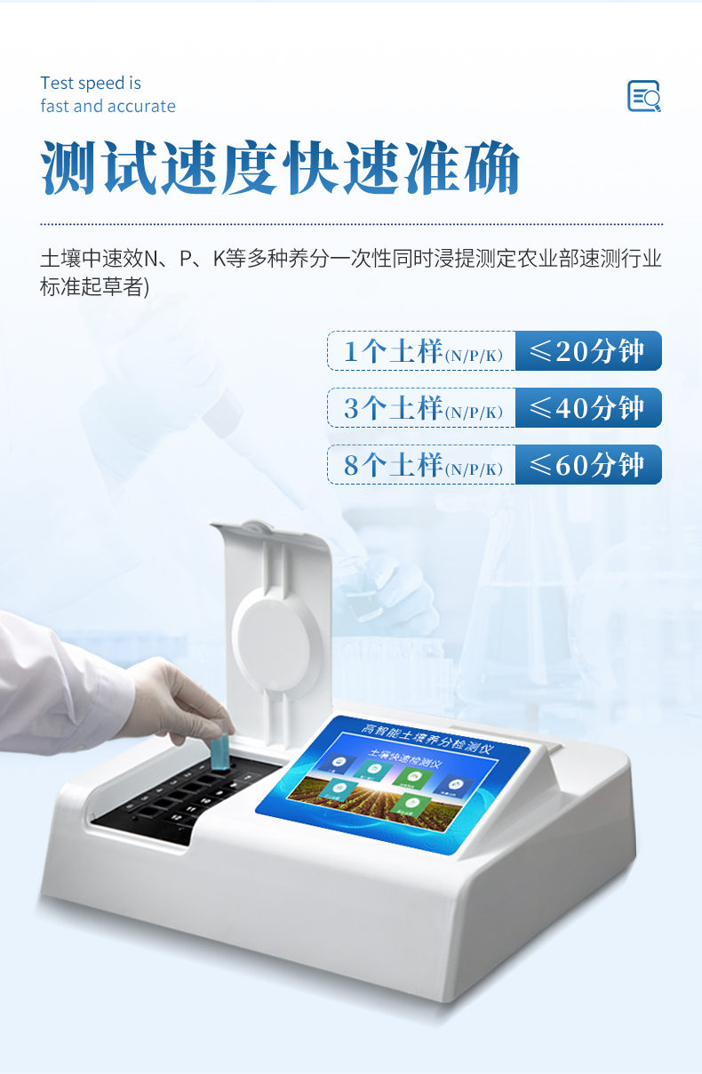 測試一個肥料樣(N、P、K)≤50分鐘,同時檢測三個肥料樣品(N、P、K)≤1.5小時。